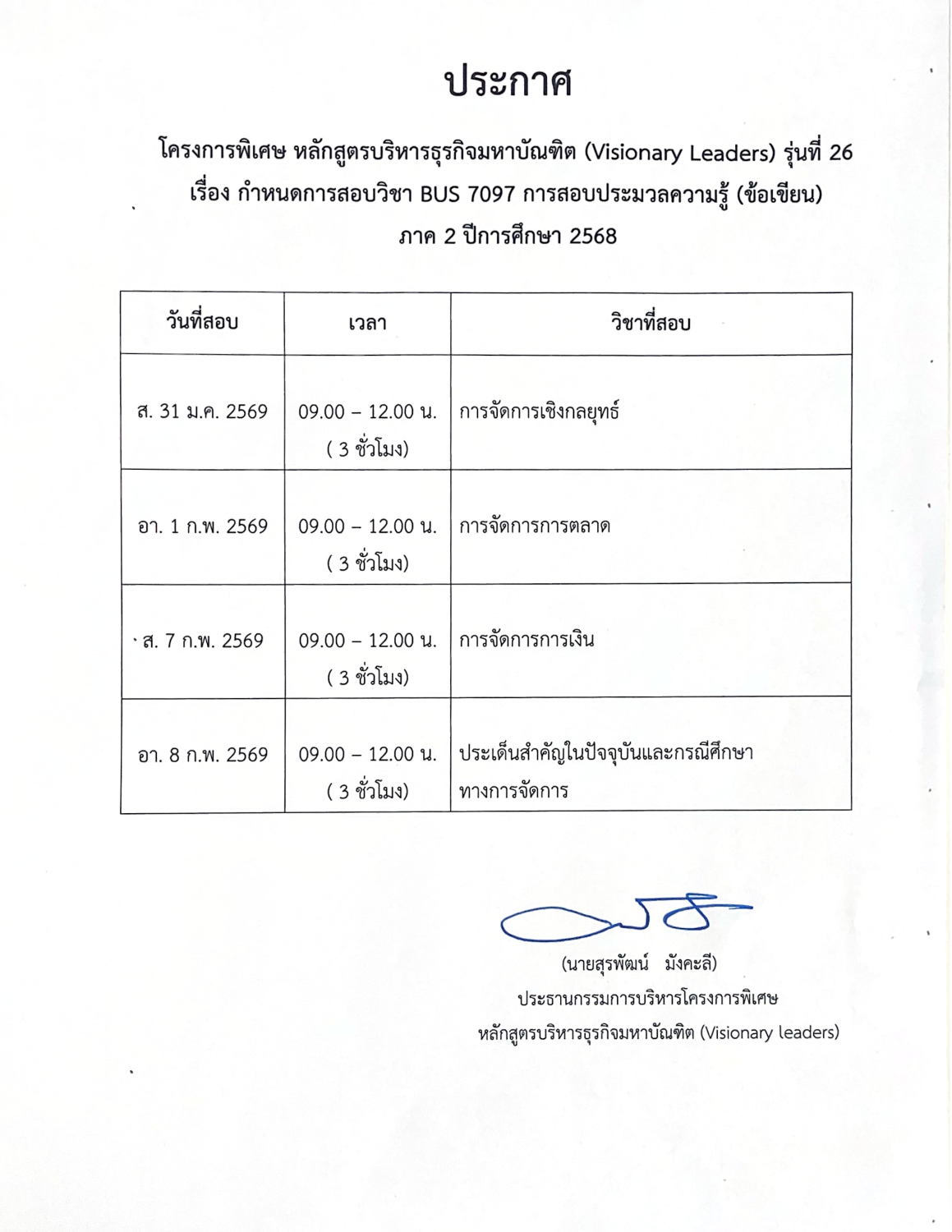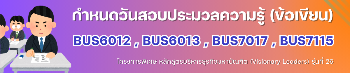 Visionary Leaders RU ตารางบรรยาย VL รุ่น 26 29 October 2025 Hits: 32 ประกาศ กำหนดวันสอบ BUS7097 การสอบประมวลความรู้ (ข้อเขียน) ภาค 2/2568 Please Rate Vote 1 Vote 2 Vote 3 Vote 4 Vote 5 สอบถามเพิ่มเติม : 02-3108900 , 081-6457865 Next article: ตารางการบรรยายสรุปการสอบประมวลความรู้ (BUS 7097) Next