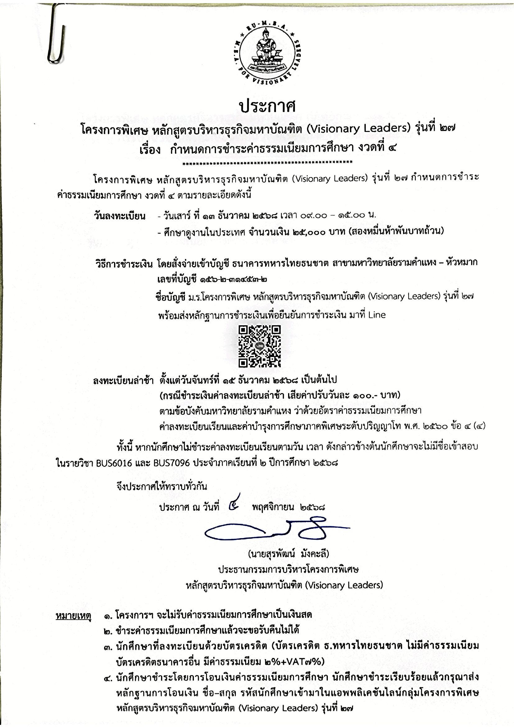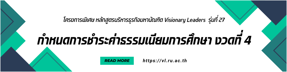Visionary Leaders RU ข่าวสาร VL รุ่น 27 06 November 2025 Hits: 25 ประกาศ กำหนดชำระค่าธรรมเนียมการศึกษา งวดที่ 4 (วันที่ 13 ธ.ค.68) Please Rate Vote 1 Vote 2 Vote 3 Vote 4 Vote 5 สอบถามเพิ่มเติม : 02-3108900 , 0816457865 Next article: ประกาศ กำหนดชำระค่าธรรมเนียมการศึกษา งวดที่ 3 (วันที่ 13 ก.ย.68) Next