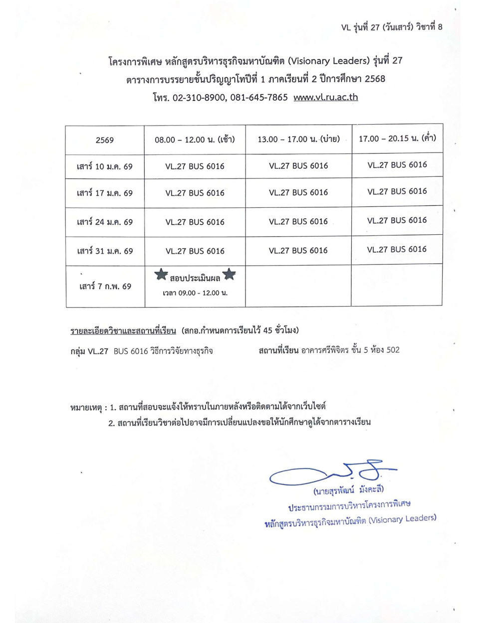 Visionary Leaders RU ตารางบรรยาย VL รุ่น 27 08 October 2025 Hits: 37 ตารางบรรยาย วิชาที่ 8 (BUS 6016) Please Rate Vote 1 Vote 2 Vote 3 Vote 4 Vote 5 สอบถามเพิ่มเติม : 02-3108900 , 081-6457865 Previous article: ตารางบรรยาย วิชาที่ 9 (BUS 7096) Prev Next article: ตารางบรรยาย วิชาที่ 7 (BUS 6015) Next