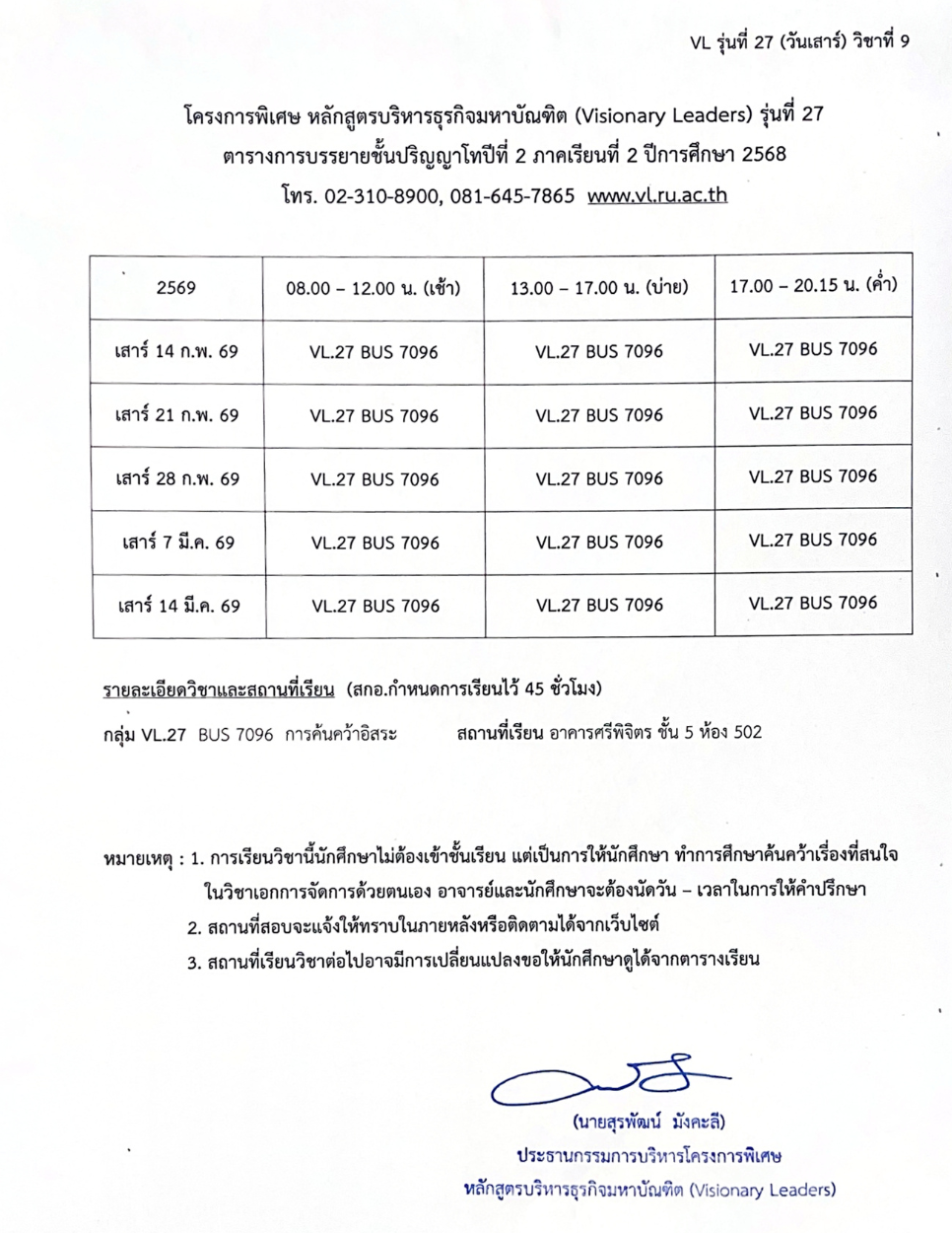 Visionary Leaders RU ตารางบรรยาย VL รุ่น 27 29 October 2025 Hits: 25 ตารางบรรยาย วิชาที่ 9 (BUS 7096) Please Rate Vote 1 Vote 2 Vote 3 Vote 4 Vote 5 สอบถามเพิ่มเติม : 02-3108900 , 081-6457865 Previous article: ตารางบรรยาย วิชาที่ 10 (BUS 7100) Prev Next article: ตารางบรรยาย วิชาที่ 8 (BUS 6016) Next