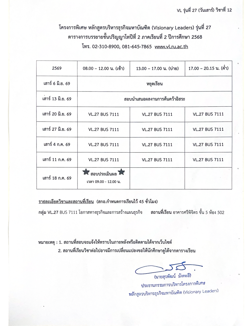 Visionary Leaders RU ตารางบรรยาย VL รุ่น 27 29 November 2025 Hits: 5 ตารางบรรยาย วิชาที่ 12 (BUS 7111) Please Rate Vote 1 Vote 2 Vote 3 Vote 4 Vote 5 สอบถามเพิ่มเติม : 02-3108900 , 081-6457865 Next article: ตารางบรรยาย วิชาที่ 11 (BUS 7110) Next
