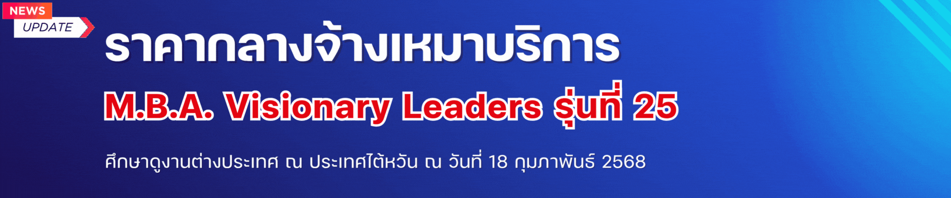 Visionary Leaders RU ประกาศราคากลาง 18 February 2025 Hits: 127 ประกาศราคากลาง จ้างเหมาบริการโครงการศึกษาดูงานต่างประเทศ ณ สาธารณรัฐจีน (ไต้หวัน) สำหรับนักศึกษาโครงการพิเศษ หลักสูตรบริหารธุรกิจมหาบัณฑิต (Visionary Leaders) รุ่นที่ 25 Please Rate Vote 1 Vote 2 Vote 3 Vote 4 Vote 5 >>> รายละเอียดเพิ่มเติม <<< ติดต่อสอบถามเพิ่มเติม : 02 - 3108900 , 081 - 6457865 Previous article: ประกาศ ราคากลางจ้างเหมาบริการโครงการศึกษาดูงานต่างประเทศ สำหรับนักศึกษาโครงการพิเศษ หลักสูตรบริหารธุรกิจมหาบัณฑิต (Visionary Leaders) รุ่นที่ 26 ณ สาธารณรัฐฝรั่งเศสและสมาพันธรัฐสวิส (ระหว่างวันที่ 18 - 24 มกราคม 2569) Prev